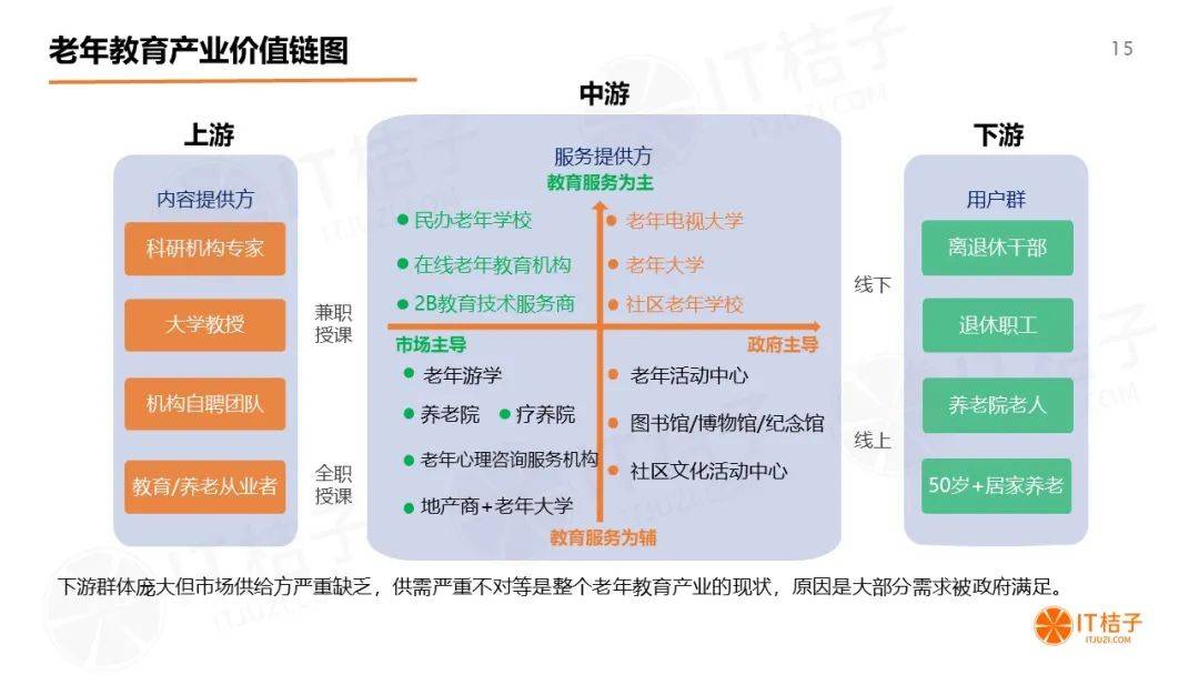 但是放眼整个“银发经济”,健康养生占绝对主导地位,文娱其次,老年教育更加小众,市场供给远远小于需求,成熟的老年教育机构也极少。