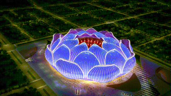 似开非开的莲花式球场,颜色随着灯光的变化而变化,橙、粉、蓝、红,从足球场内部还能散射出璀璨的金光,好似速速召唤观世音菩萨入座。以至于效果图传上网络后,有网友配上了菩萨效果图,丝毫没有违和感。