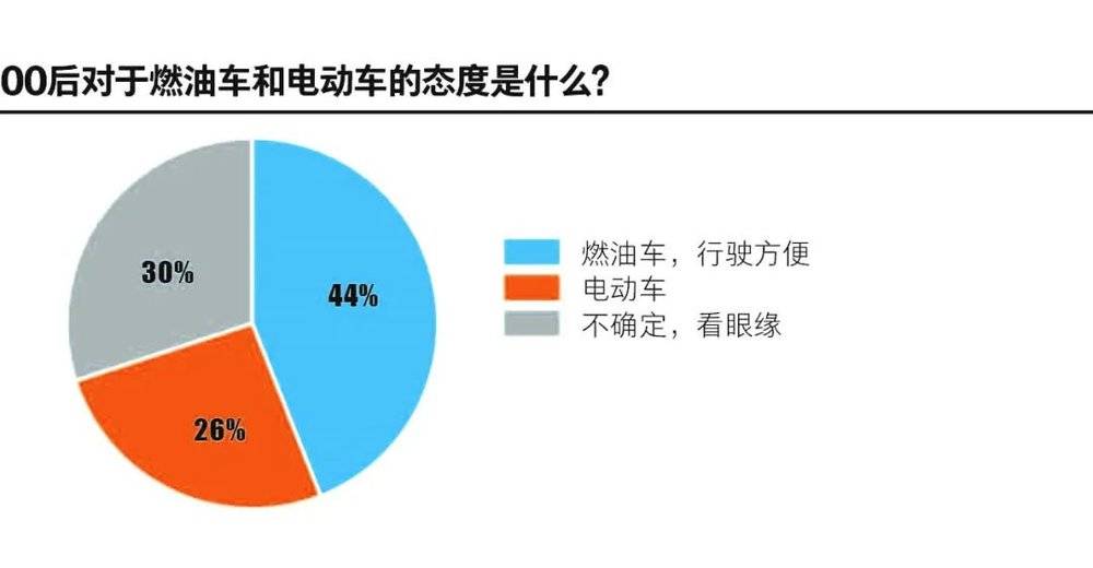 让人意外的是,在选择燃油车还是电动车的选项中,有30%的受访者表示“不care(在意),看眼缘”。其余受访者中,44%的人选择了燃油车,26%的人选择了电动车。这被认为显示出了00后用车的特殊性,由于他们并不需要对“家庭出行”的需求进行考虑,日后工作出勤所需也存在不确定性,因此,燃油车还是电动车完全取决于个人喜好,动力之外的其他因素反而可能成为决定选择的关键。这也佐证了上述调查中00后对动力性能关注度低的表现。