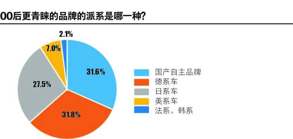 不过,00后对汽车品牌的价值排序显然已经颠覆了以往。调查显示,在“选哪个派系汽车品牌”这一问题中,31.6%的受访者选择了中国自主品牌,认为其进步很快,在智能化等技术上已经处于领先水平,这一比例基本本的德系车比肩。