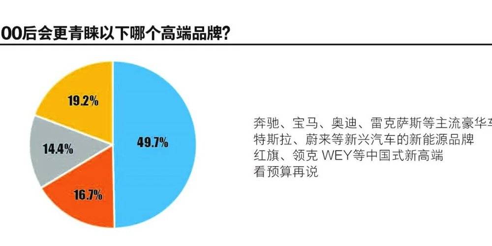 除了力挺自主品牌,00后对于新兴品牌也显示出了超过市场预期的接受度,新造车品牌和本土新豪华品牌开始出现在00后的备选清单中。调查显示,在对高端品牌的青睐度上,虽然奔驰、宝马、奥迪、雷克萨斯等主流豪华车仍然获得近50%的支持率,显然主流豪华仍然是最重要的第一选择。
