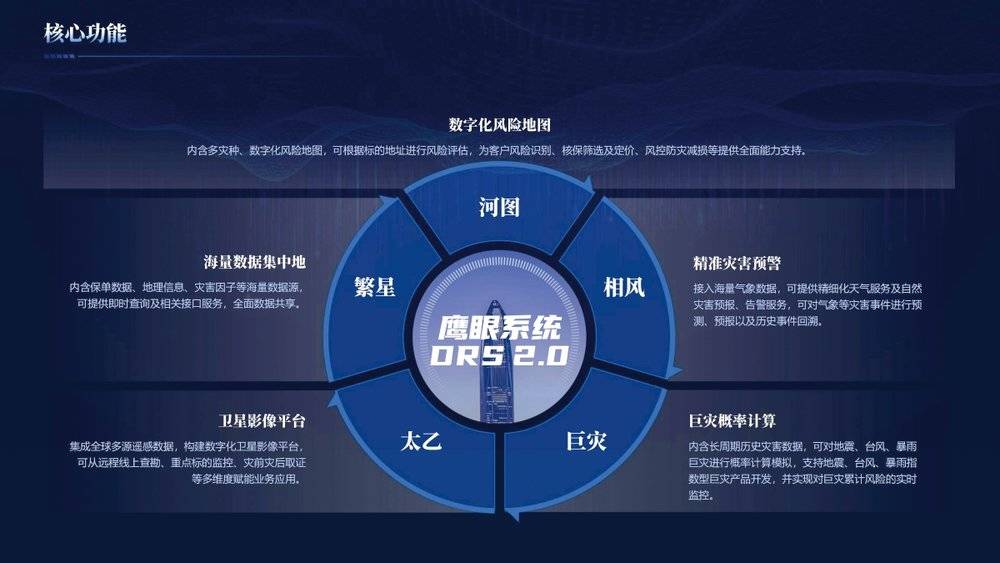 例如,平安产险鹰眼系统,聚合了超2万亿条地理、灾害、气象、保险数据,可以利用数值模拟、机器学习、卫星遥感监测等技术,实现风险筛查、灾害预警、精算定价、巨灾风险管理等多场景应用。