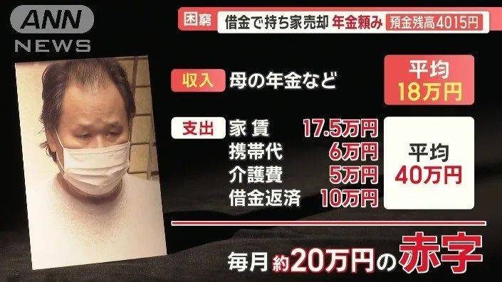 在母亲卧床不起的最后三年时间里,他向银行与亲朋好友借款800余万日元,只能通过出售自己的祖宅再租住的形式短期内筹得2200万日元用以还债与维持日常生活。但每月20万日元的赤字使得这笔钱在短短两年内就用尽了。