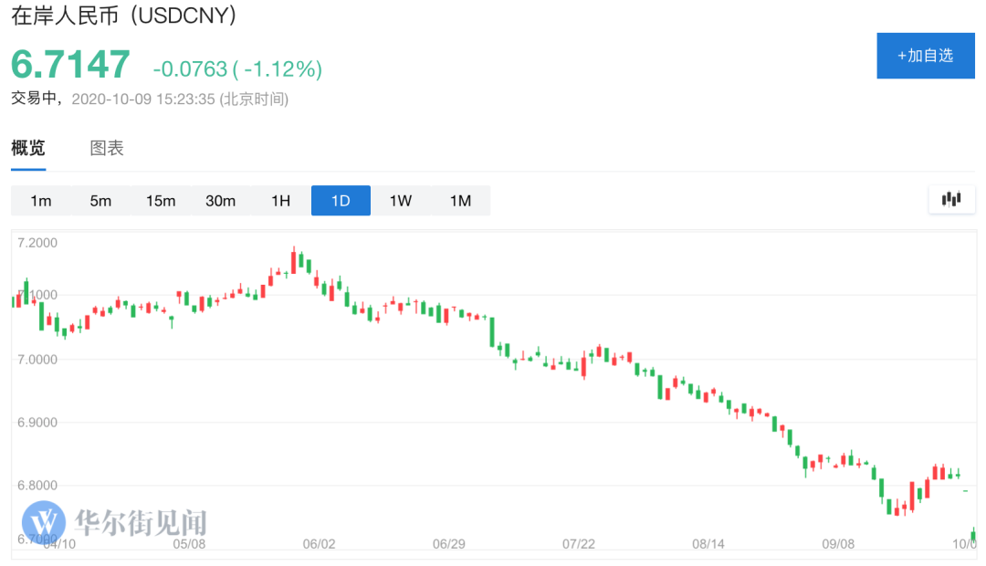 数据显示,10月以来,离岸人民币市场已经涨超800点,一度冲破6.71关口。