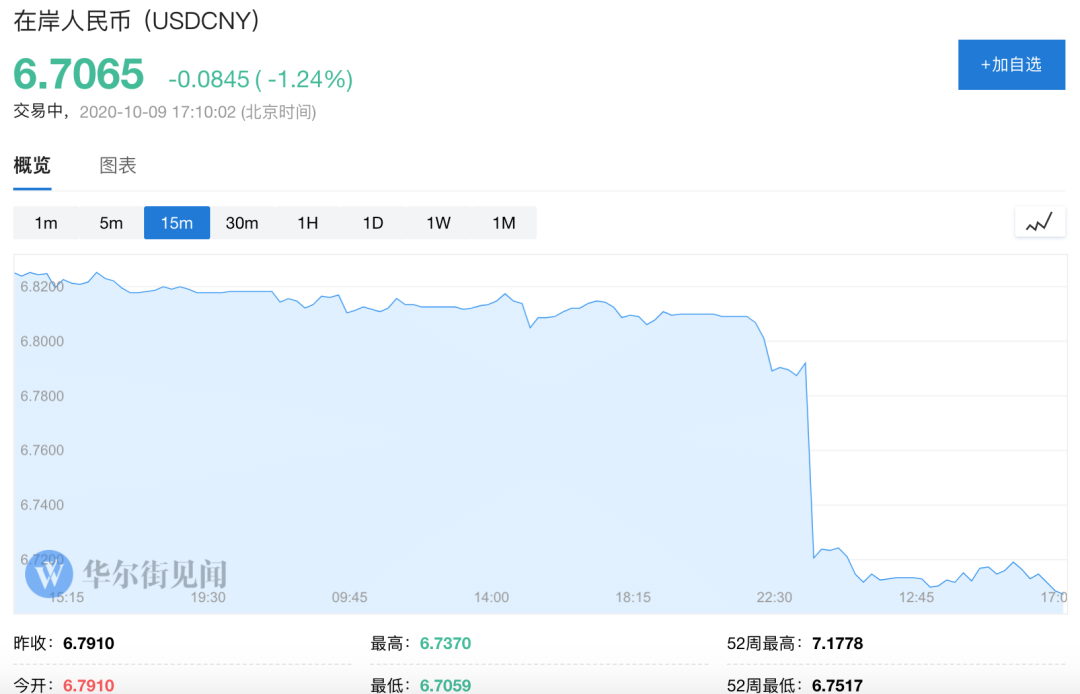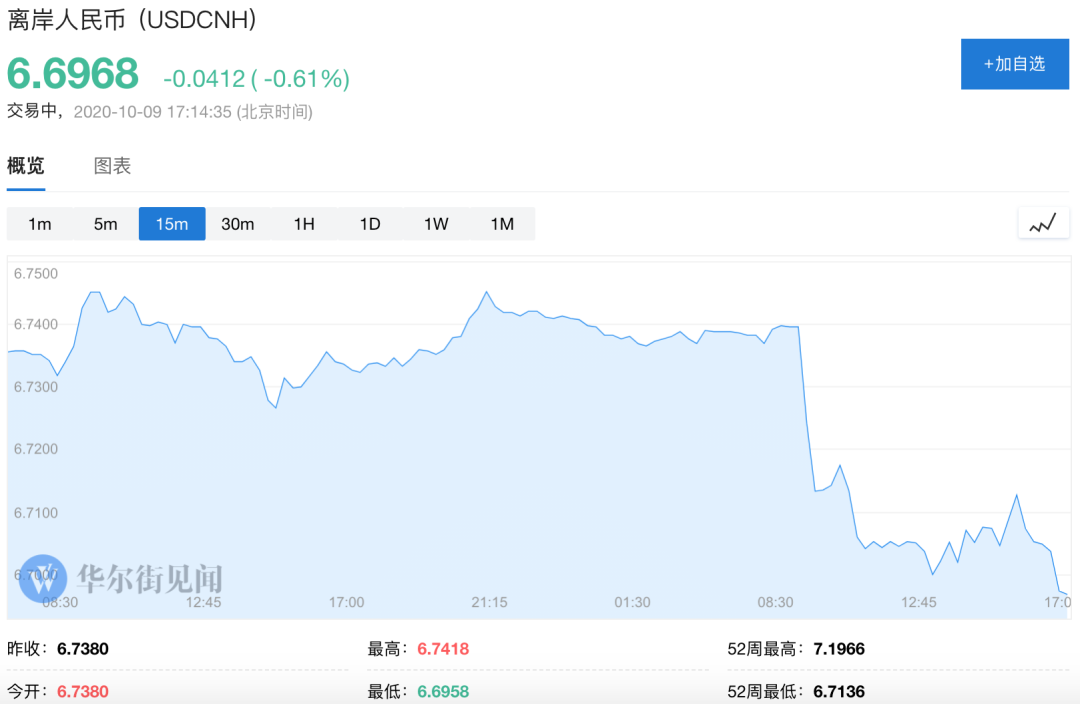 盘初,离岸人民币兑美元一度涨破6.71关口,最高至6.7075元,创2019年4月22日来新高,日内涨约300点。