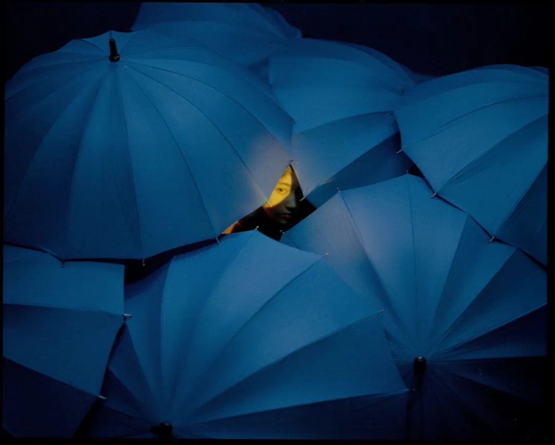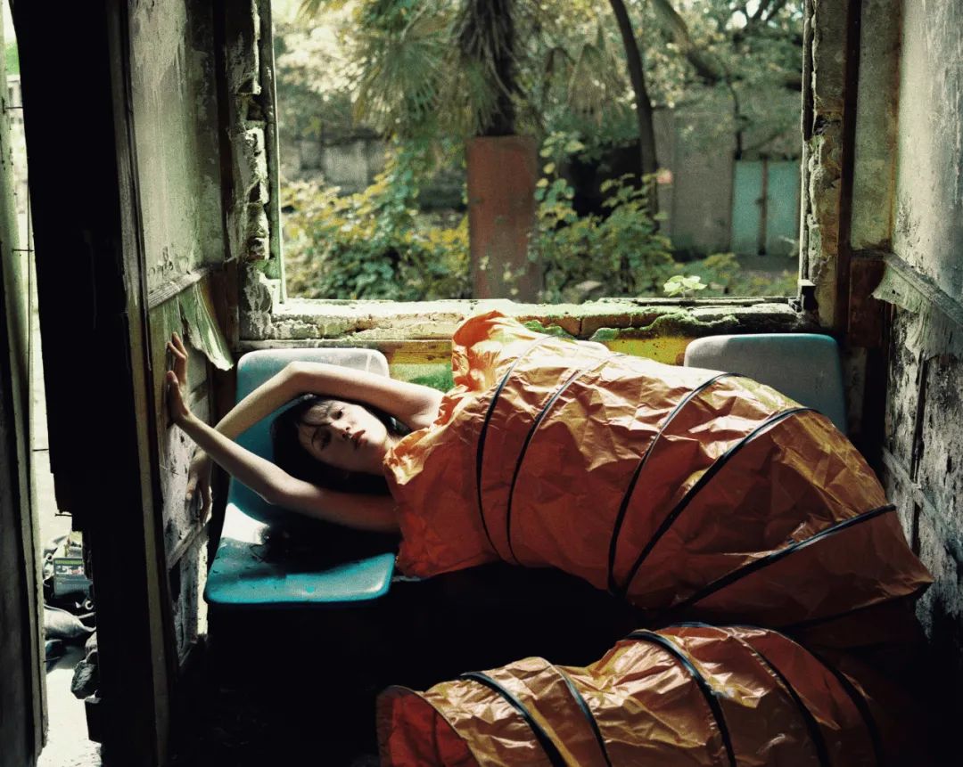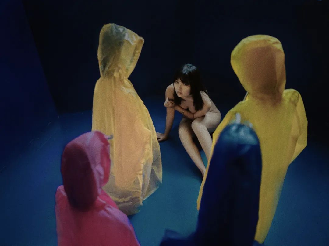 她极度缺乏安全感,总觉得别人在窥视她,想对她做什么。所以拍摄的时候,我就摆了几个穿着雨衣的人形模特在她四周,她在中间无助地看着镜头。
