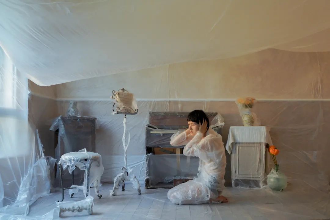 照片里我让她捂着耳朵,在塑料布包裹着的环境里,想让她去屏蔽一些外界的声音。