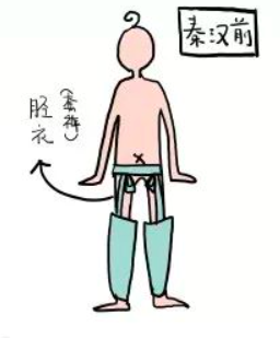 先秦时候,大家上身穿“衣”,下身穿“裳”。如果你胆敢捞起别人的裳,会看到“胫衣”,字面意思就是小腿穿的衣服。这个东西是裤子的雏形,没有裤裆,没有裤腰,就是两只分开的裤管,覆盖小腿附近,上端用带子把它固定在腰上,主要起个保暖作用,跟护膝有点像。