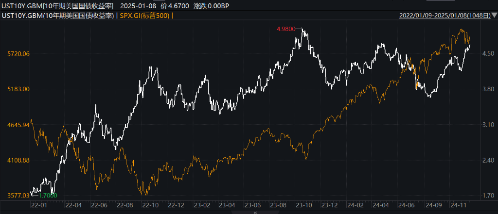 在2023年10月期间,10年期美债收益率一度上逼5%,当时美股出现大幅回调。