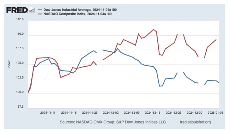 第二个解释是,股市最近的上涨实际上相当狭窄。可以说,这主要是因为人工智能的影响。道琼斯指数可以看作是非AI经济的代表,它已经几乎抹平了特朗普效应的涨幅。