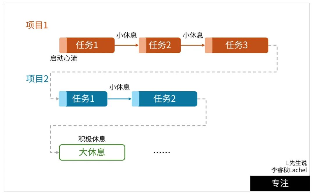 但是,这种做法没办法解决“注意力不饱和”的问题。所以我们需要第二步:交替活动。也就是:每经历3-4个冲刺阶段之后,换一个项目,继续冲刺。
