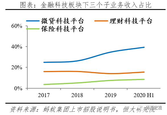 数字金融科技平台贡献收入64%,网络借贷占比高。此板块为多元金融服务,以交易佣金、利息收入、投资收益等作为主要收入,2017年~2020上半年营业收入分别289.9亿元、406.2亿元、677.8亿元、459.7亿元,占比从44.3%增长至64.4%,是蚂蚁最大的收入来源。下设微贷科技平台、理财科技平台和保险科技平台,2020年上半年收入占比分别为39%、16%、8%。