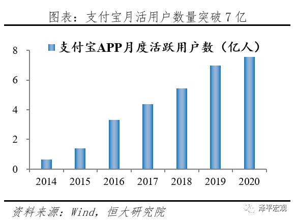 2)依托阿里生态场景,提高客户粘性。支付宝脱胎于阿里巴巴生态体系,截至2020年6月阿里巴巴国内零售市场移动月活用户数达8.74亿,线上线下、国内国际具有丰富的应用场景,包括C2C电商淘宝、B2C电商天猫、B2B电商1688、O2O新零售盒马等,生活服务包括公共事业缴费、饿了么、飞猪等,国际业务包括天猫国际、速卖通等,支付业务具有高频的特点,丰富的场景导流加大了客户的粘性。