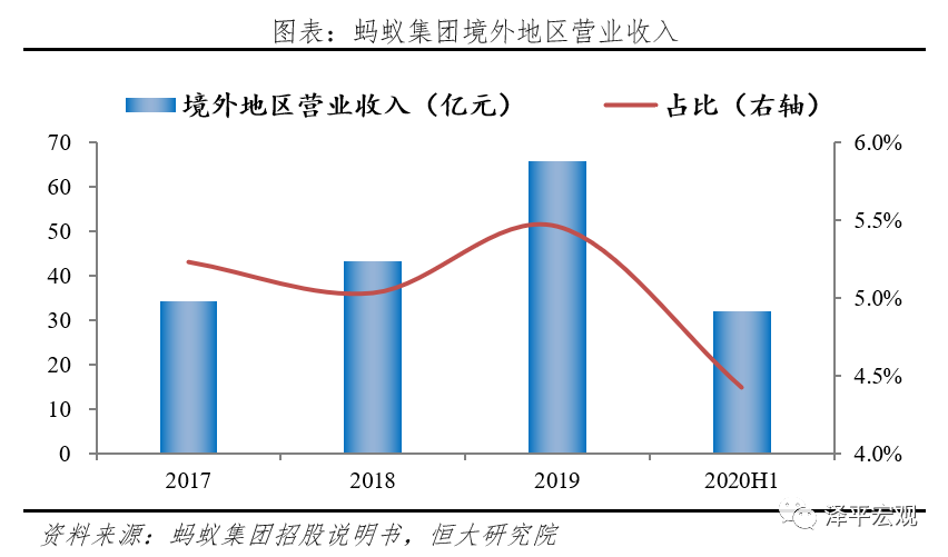 根据蚂蚁集团招股说明书,截至2020年6月止的12个月内,通过公司平台处理的国际总支付交易规模达6219亿元,2017年~2020上半年境外地区营业收入分别为34.2、43.1、65.86、32.1亿元,占比5.23%、5.03%、5.46%、4.42%。