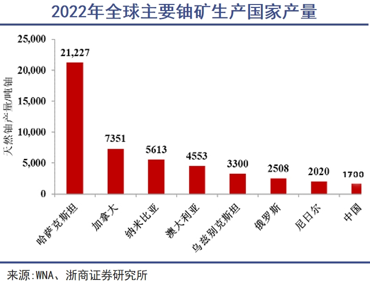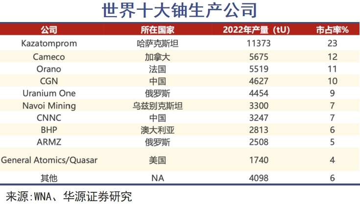 与此同时,铀矿全球分布不均匀,澳大利亚、哈萨克斯坦、加拿大、俄罗斯和纳米比亚五国占据了近七成的份额。而其中,由于开采成本最低,哈萨克斯坦成为全球铀矿产出第一大国。