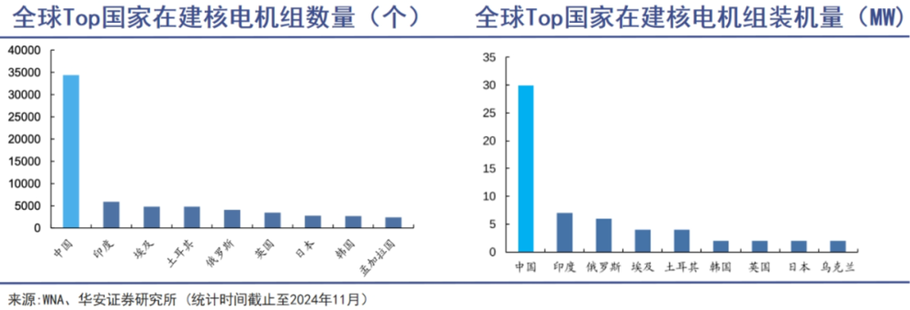 增量方面,截至2024年11月末,全球在建的66个核电机组中,有近一半(30个)位于中国,在建机组数量占全球45.5%,在建装机容量高达34377兆瓦,占比47.9%,无论是数量还是装机量均高居世界第一。