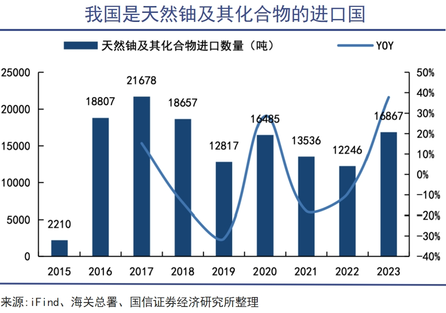 2023年,我国进口天然铀1.7万吨,主要来自哈萨克斯坦(1.1万吨)和纳米比亚(5734吨),还从俄罗斯进口了467吨的U-235浓缩铀、钚及其化合物。