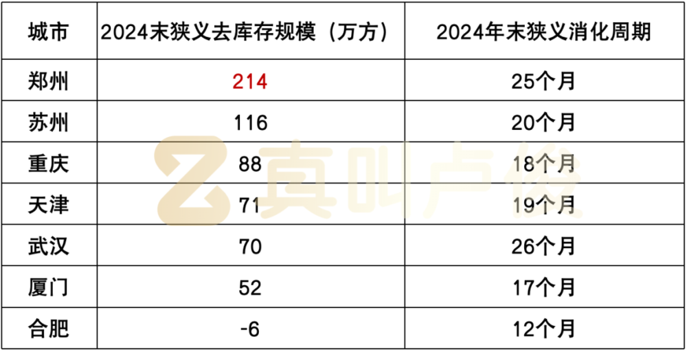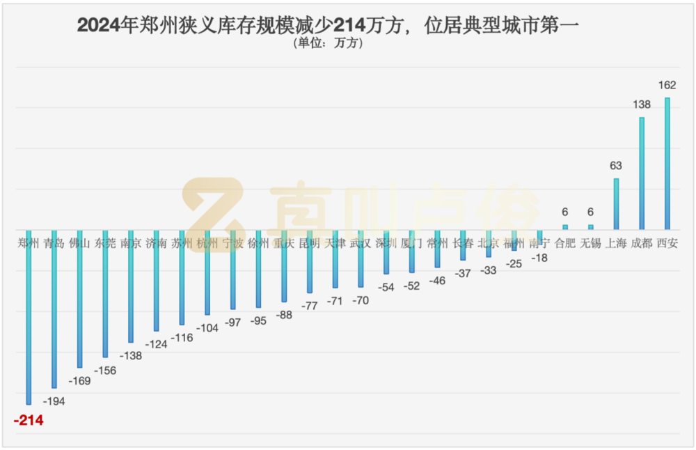 整个2024年郑州狭义库存规模减少了214万平方米,位居所有典型城市之首。