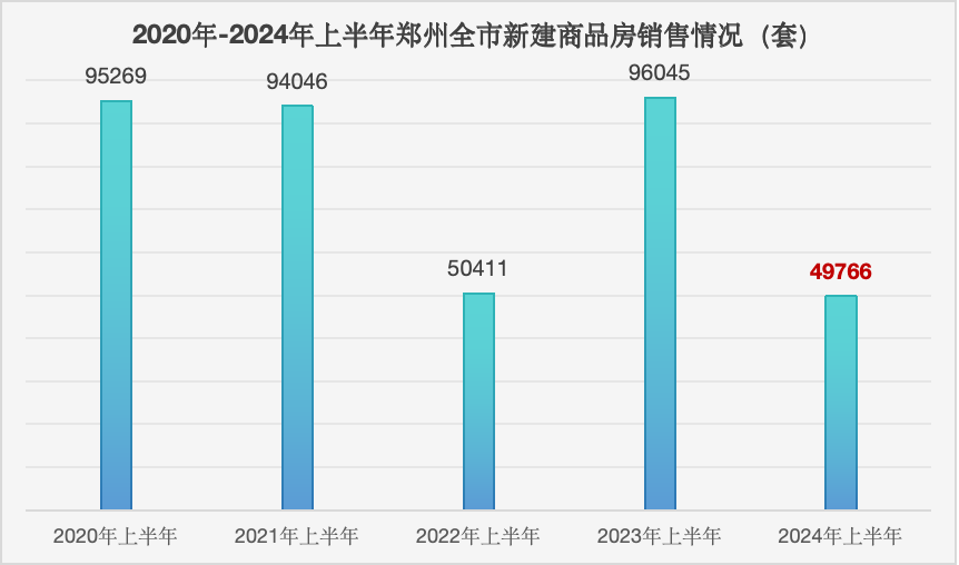 可以看到在2024年上半年,郑州新建商品房共计成交49766套,与2023年上半年的96045套相比,同比下跌48.2%,成交量近乎腰斩,创下近5年新低。