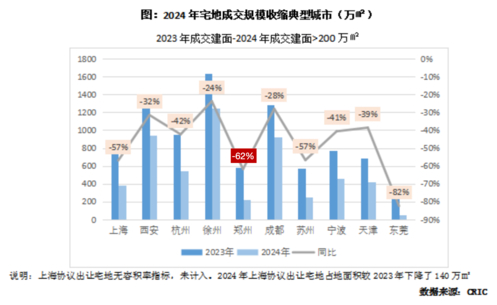 整个2024年有10个城市土地成交量较2023年下降超过200万平。