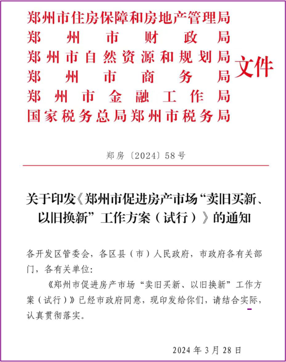 早在2024年3月28日,郑州就率先发布了《郑州市促进房产市场“卖旧买新、以旧换新”工作方案(试行)》,甚至比上海的5月更早。