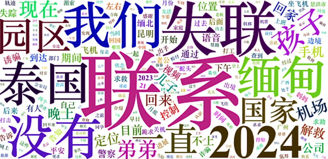 与文档中另一个高频词“希望”(195次)相映衬的是,据凤凰卫视2025年1月13号报道,泰国和中国政府已成立警察协调中心,专门负责打击电信诈骗,追踪从泰国被诱骗到邻国的失踪人士,并加大有关人口贩卖和其他跨国犯罪的资讯交流、控制非法越境活动。