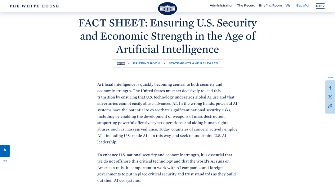 美国政府声明中称,人工智能正迅速成为安全和经济实力的核心。美国必须采取果断行动,引领这一转变,确保美国技术支撑全球人工智能的使用,并确保对手无法轻易滥用先进的人工智能。