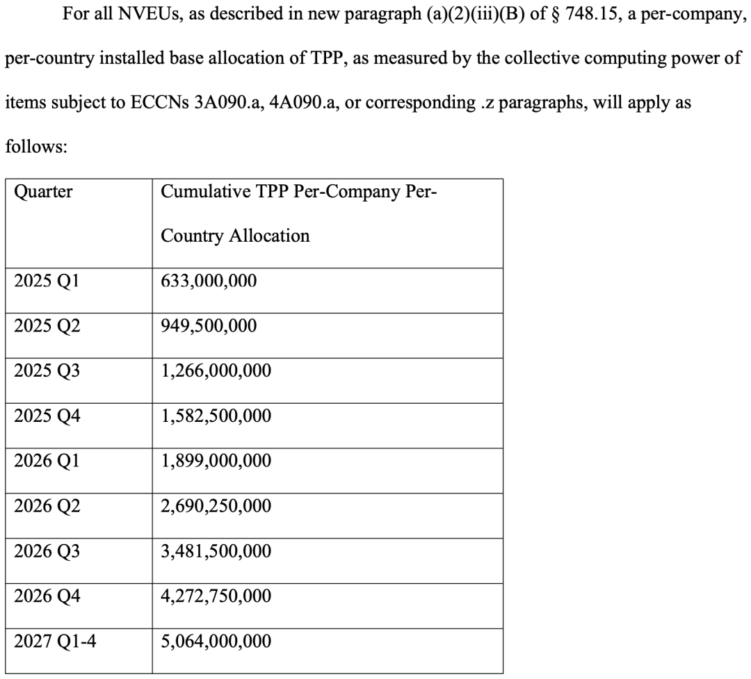 “最终规则”甚至对NVEU中国家或地区及主体每个季度的累计可配额的总体算力性能(Total Processing Performance,简称TPP)进行了明确限制。一位云计算厂商人士对《财经》表示,通过限制总体算力性能的做法进行全球市场管制,既不符合技术逻辑,也不符合市场原则。