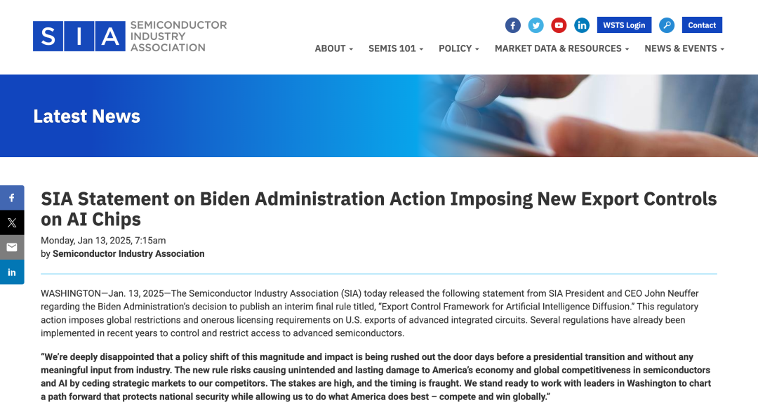 美国半导体协会1月13日声明称,我们深感失望的是,如此规模和影响的政策转变在总统过渡前几天匆忙出台,而且没有得到任何来自行业的有效意见。新规则可能会将战略市场拱手让给我们的竞争对手,从而对美国经济和半导体及人工智能领域的全球竞争力造成意想不到的持久损害。