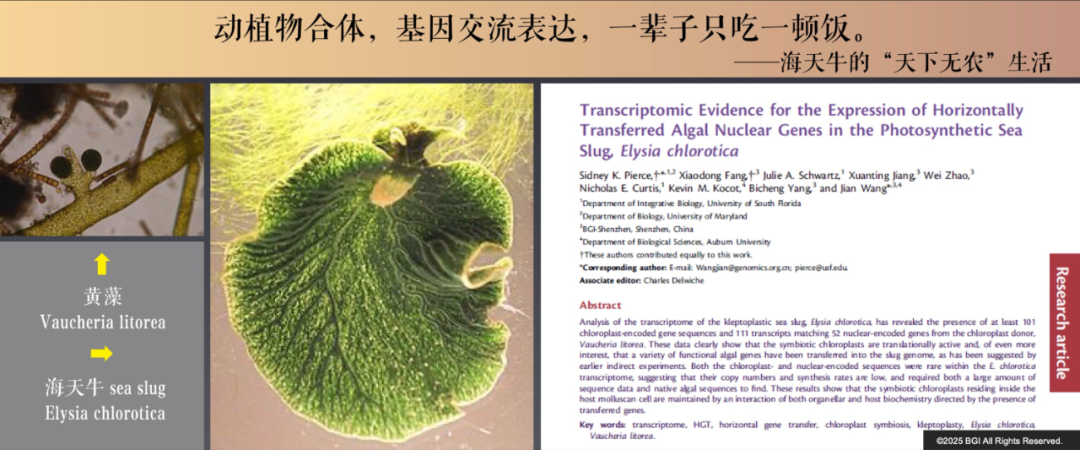 举一个例子,这玩意儿叫海天牛,你说它是动物吧,它能够自养,你说它是植物,它又可以吃其他的东西。一生吃一顿饭,第一顿吃一点蓝绿藻或者是黄藻,就会把黄藻的基因遍布全身,它就有了叶绿体,自己能给自己供给能量,这是动物还是植物?