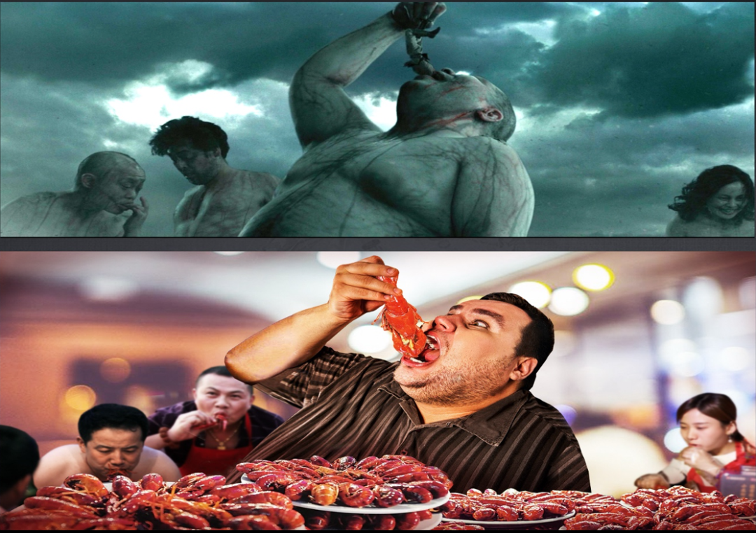 几年前看一个漫画,叫《进击的巨人》,有人说巨人好残忍,没事就弄个人吃吃。很多朋友给我发这个图的时候,我回复了一张图,有区别吗?人吃小龙虾残忍吗?某种程度上讲,巨人能吃人,你能吃龙虾,这两个事情很公平,就跟我说的食人鱼和食鱼人的故事一样。
