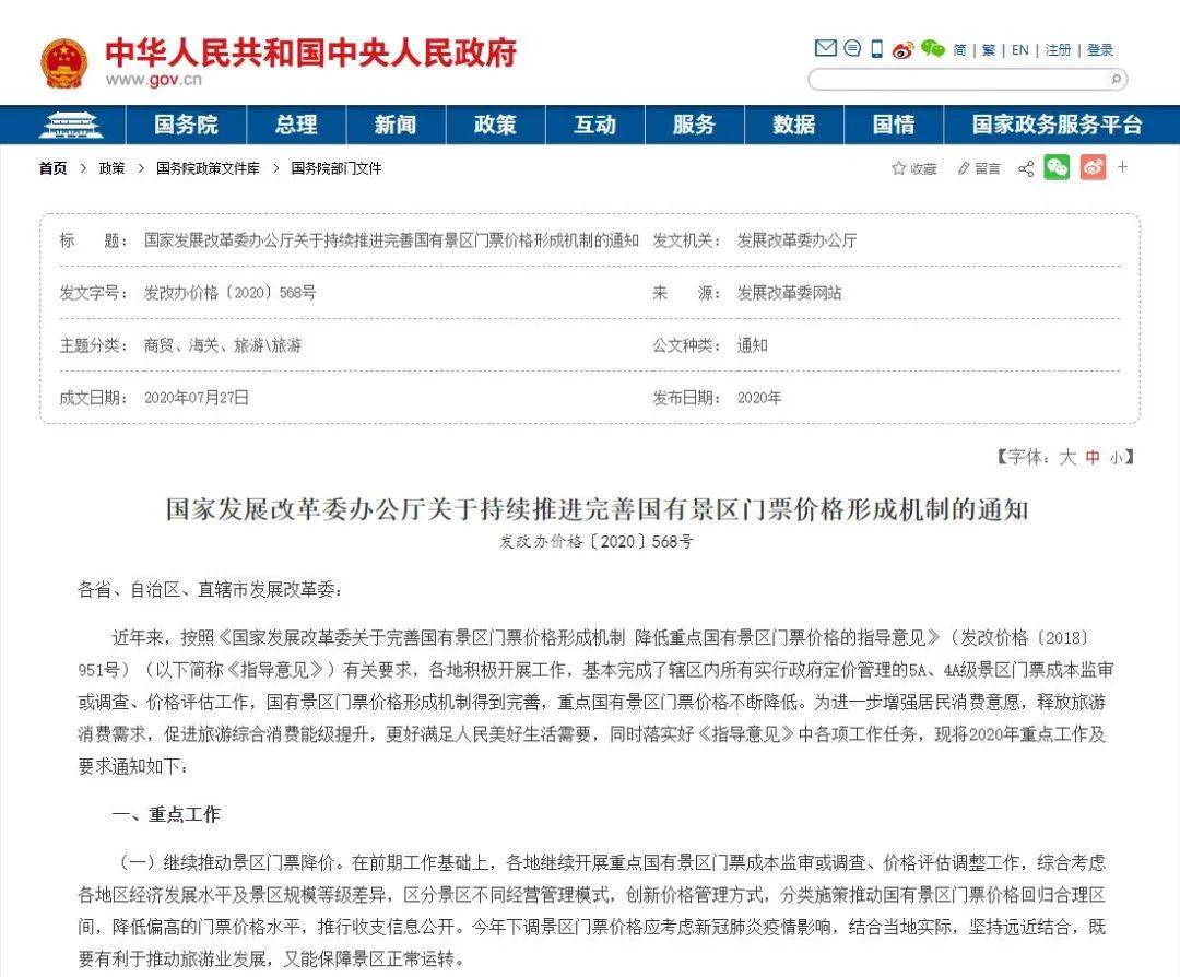 7月27日,国家发改委下发《关于持续推进完善国有景区门票价格形成机制的通知》(发改办价格〔2020〕568号),文件称,“要继续推动景区门票降价,不断完善门票价格形成机制,着力规范景区价格行为,切实落实门票价格减免政策”。还把景区门票降价提高到政治和整体经济角度去看,提到”进一步提高政治站位,充分认识完善景区门票价格机制对提升旅游消费质量水平、激发旅游消费潜力、带动经济增长的重要意义“。