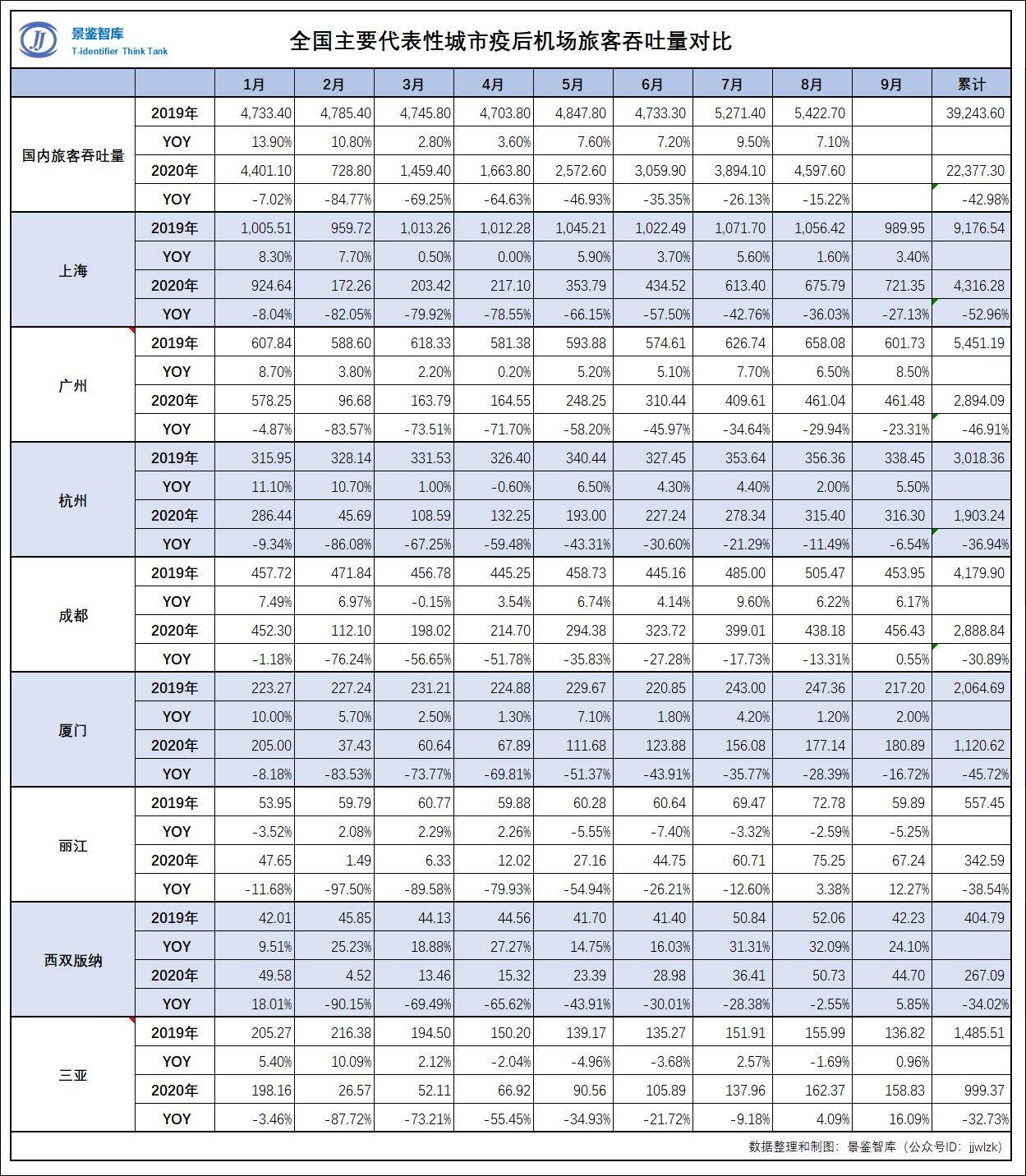 不仅仅是三亚,丽江、西双版纳等知名旅游度假目的地城市的流量也在第三季度迅速恢复增长。笔者摘取了一些代表性城市的航空吞吐量进行对比,比如一线代表性商业中心城市上海、广州(国际航班大幅减少,受影响跌幅较大),新一线又有旅游属性的城市杭州、成都(至9月基本恢复),以及纯粹的远途度假目的地城市丽江、西双版纳、三亚(增长强劲)。