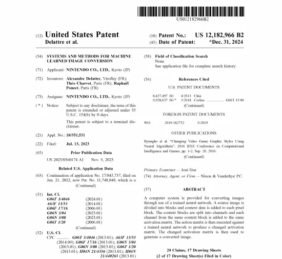 而且,老任自身对此也有技术储备。任天堂在2023年7月提交的一项专利在2024年底通过了美国专利局的审核,这项技术通过神经网络算法,也能够将540p的图像转换1080p图像。但与DLSS不同的是,任天堂的专利更侧重于图像转换和风格化,例如将一种图像风格或细节增强为另一种风格。也就是说,经过优化输出的图像,不仅仅是分辨率的提升,而且能够在美术风格上进行判断和增强。大胆设想,如果与DLSS配合使用,能够实现帧率、分辨率和美术效果的整体画面提升。而在画面提升的同时,不增加游戏程序整体的体积,使游戏能够塞进更小的卡带里面。