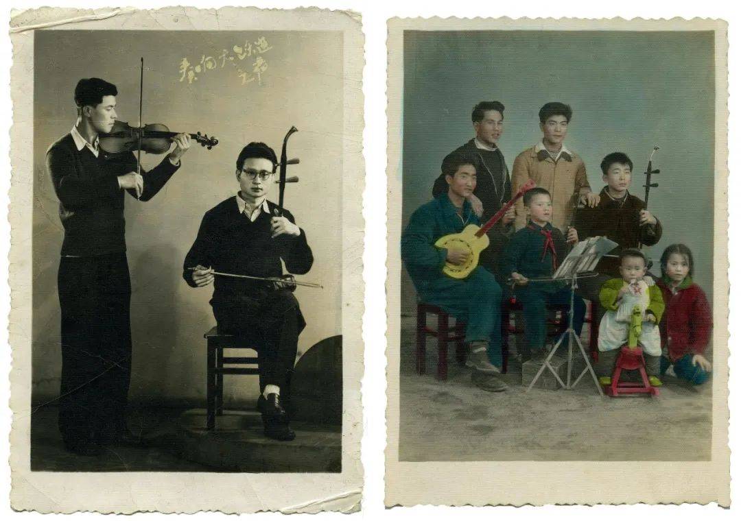 此外,照相馆里往往会备有小提琴、二胡、琵琶、手风琴、笛子等各种乐器,一家人坐到一起拍照时,会把乐器分配到每个人手里,做出表演状。
