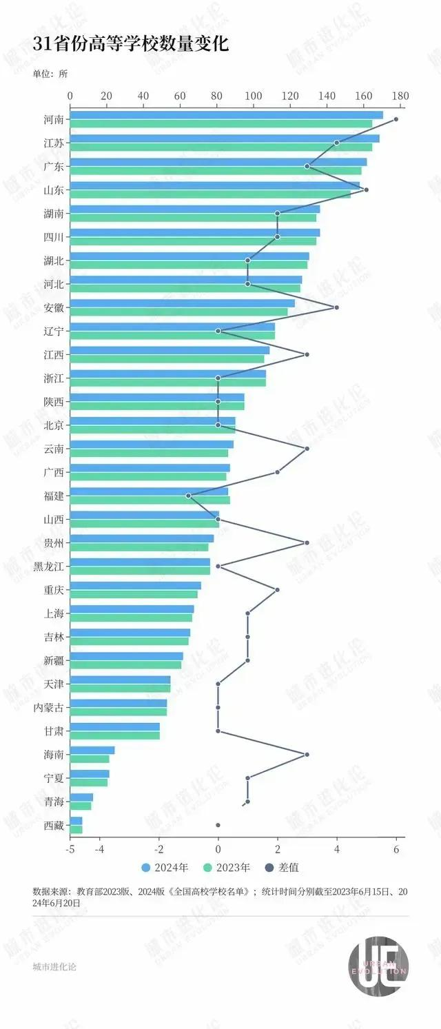 横向比较,福建高校数量在东部省份中排名垫底,仅高于上海和天津两个直辖市;纵向观察,福建是去年唯一一个新增高校数量为负数的省份,因福建对外经贸职业技术学院被撤销办学而减少一所。