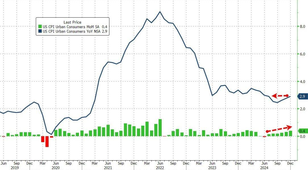 具体数据显示,美国12月未季调CPI年率录得2.9%,符合市场预期,前值为2.7%,为连续第三个月反弹,至2024年7月以来新高;12月季调后CPI月率录得0.4%,高于预期的0.3%,前值为0.3%。