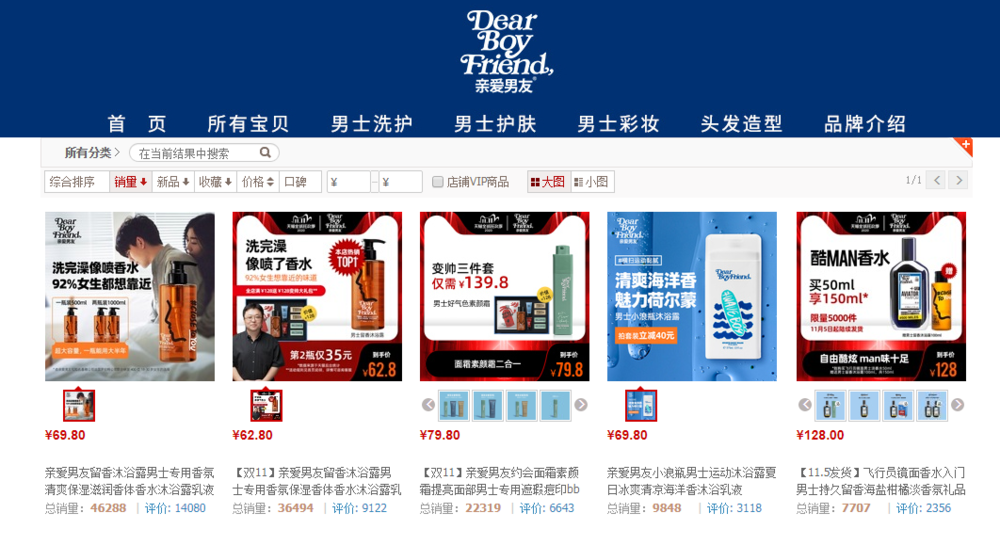 根据各品牌天猫旗舰店的数据显示,理然销量最高的是一款售价84.9元的氨基酸洗面奶,总销量是13万+;亲爱男友在天猫卖得最好是一款留香沐浴露,总销量为4.6万+,售价是69.8元;蓝系男士护肤套装礼盒销量最高,总销量为7770,售价是109元;HeyBro销量最高的是一款防脱发搽剂,总销量为7511,售价是114元。