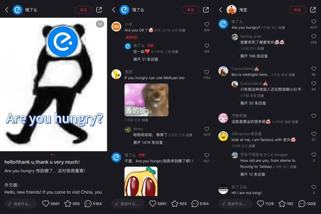 比如,饿了么、淘宝、多邻国、高德等官方账号都展现出了活跃度,以有趣的方式进行自我介绍,相互留言导流。
