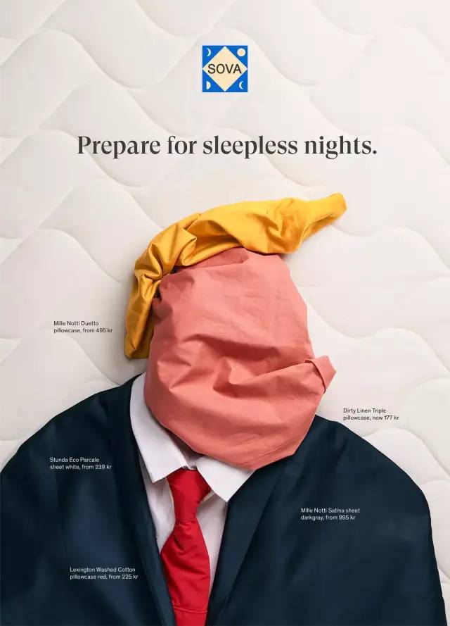 瑞典零售公司Sova就利用这样的洞察,用他们的商品拼接出了一个川普形象,从视觉上加强与近期被人们所讨论的大选做连接。文案“为不眠之夜做准备”,既点明了川普连任悬念很大,又说明大家都想连夜吃瓜的心态。更有心机的是,如果你仔细看,你就会发现图中呈现的商品都是枕套和床单这类床上用品,又与文案相互呼应。这句“一语三关”的文案,实在有点妙。
