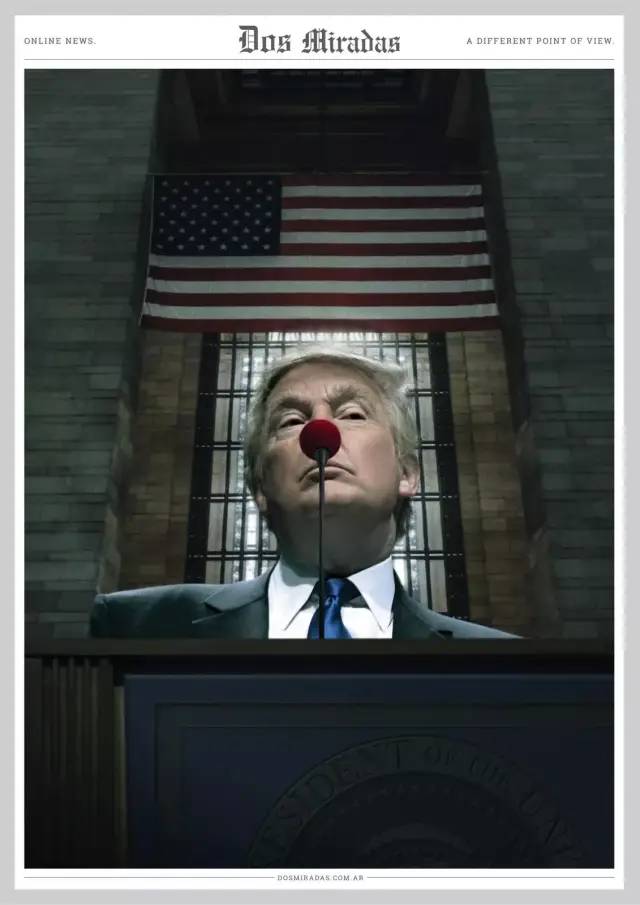 线上新闻平台Dos Miradas就巧妙地利用错位,把红色的麦克风套变成小丑的标志性的红鼻,让自我感觉啥都懂的川普以小丑的形象出现。在“眼球经济”的时代,这支广告一下就抓到了观众的注意力。