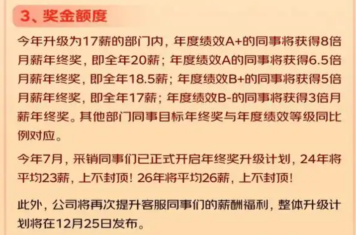 这两天风头正盛的小红书,据说今年年终奖最高可以拿到50个月的月薪。京东年终奖发得就很高调,还专门公布了一份《2024年年终奖发放计划通知》,从3倍月薪到8倍月薪不等。