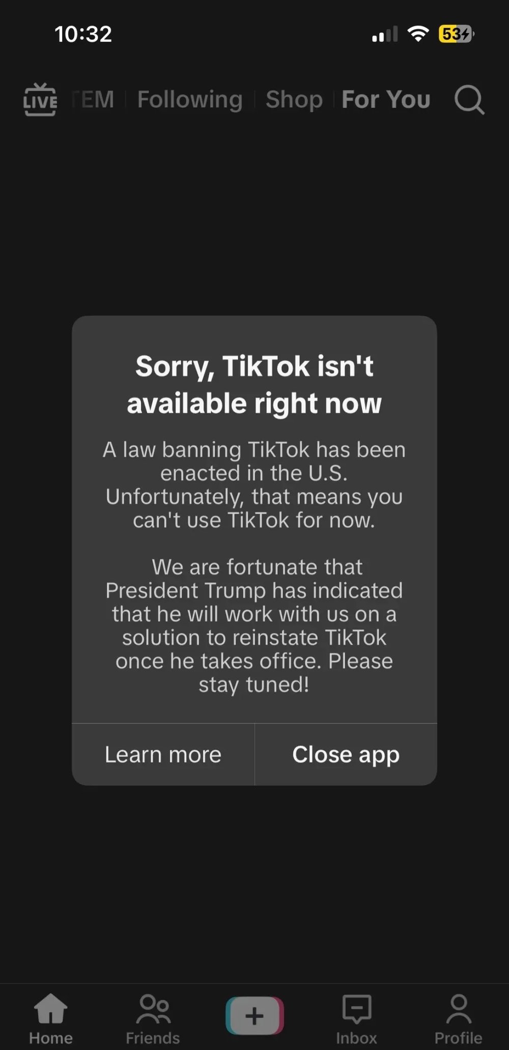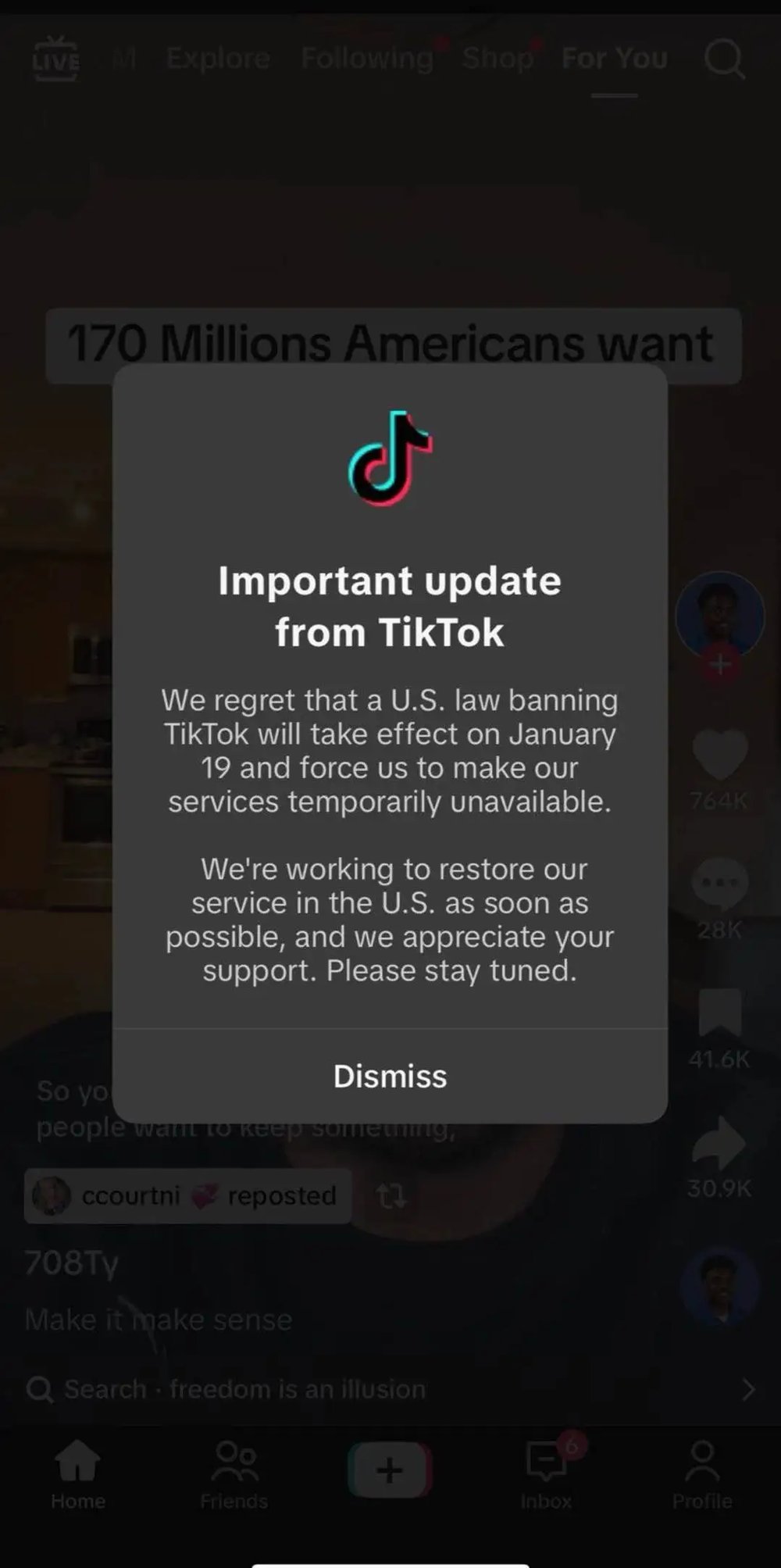 我们很遗憾,一项封禁 TikTok 的美国法律将于 1 月 19 日生效,并迫使我们暂时停止提供服务。