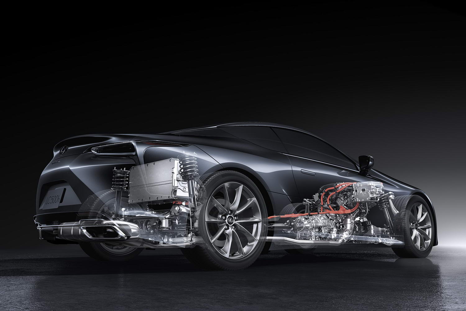 LC 确实花了雷克萨斯不少功夫,事实上,它是新平台 GA-L 的第一款作品,而 GA-L 是丰田 TNGA 架构下专为雷克萨斯开发的。虽说和晚一年诞生的新旗舰轿车 LS 同平台,但 LC 拥有显而易见的低矮坐姿,前悬架上部专门设计以降低机舱高度。前置引擎重心已位于前轴之后,翼子板、机舱盖、门外板都是铝,车门和尾舱结构件甚至动用了碳纤维,来获得更佳的重量分配。