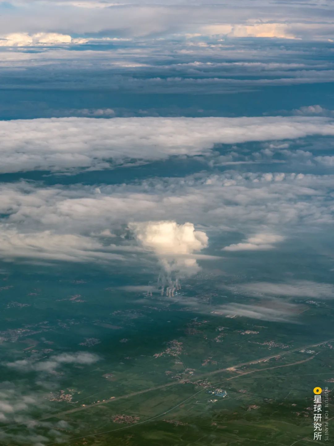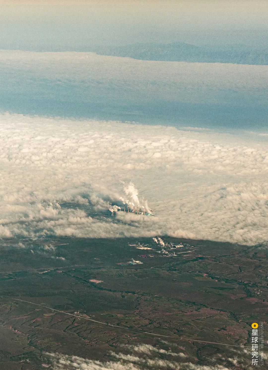 (托克托电厂,从数千米高空俯瞰,依然清晰可辨,直冲云天的烟雾是电厂排出的水汽,摄影师@陈剑峰)
