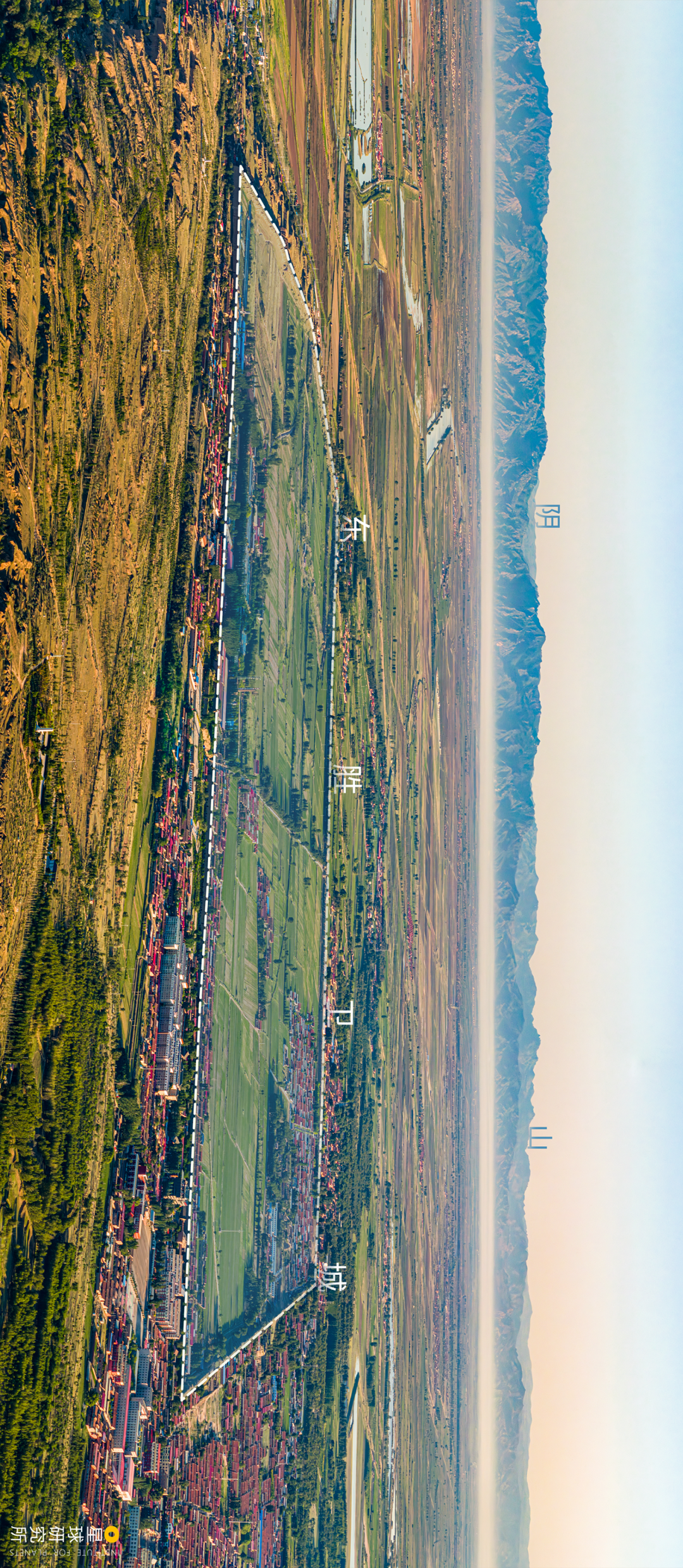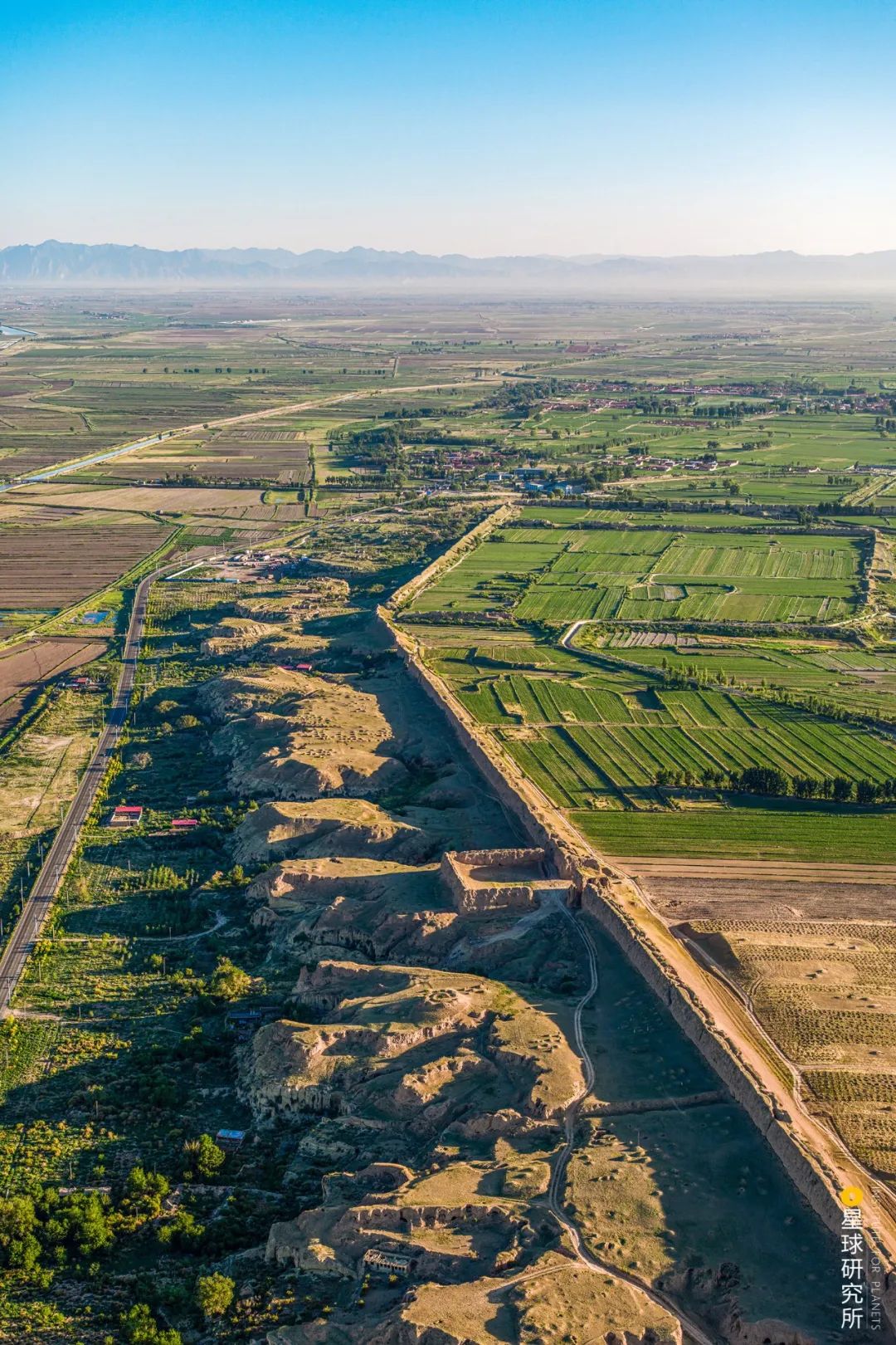 (请横屏观看,托克托地区的古城,远处为阴山,摄影师@周昫光/星球研究所,制图@张琪月/星球研究所)