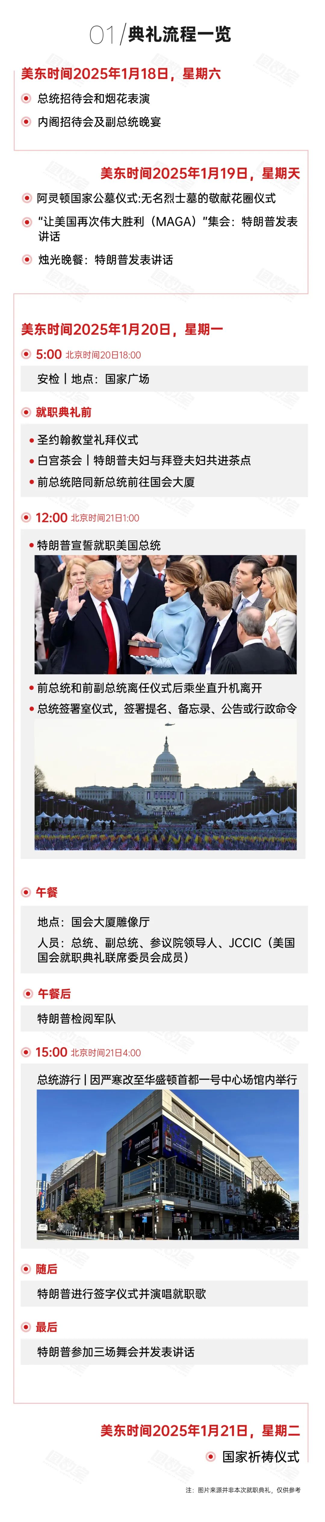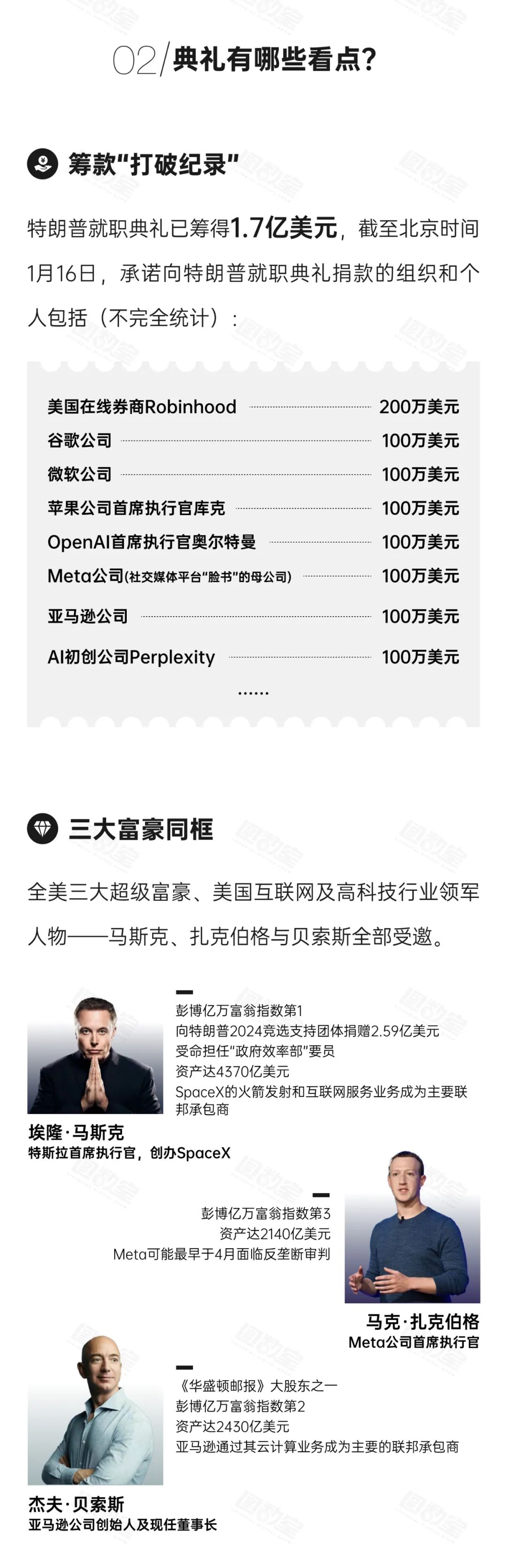 本文来自微信公众号:图数室,作者:图数室,头图来自:视觉中国美东时间1月20日(即北京时间1月21日),美国候任总统特朗普将在美国国会大厦宣誓就职。就职日前后将举行一系列活动,不少知名人士参与其中。美媒报道称,特朗普希望将这一仪式打造成“全球盛事”。典礼筹款1.7亿美元,哪些金主在捐款?为期四天的就职典礼都包含哪些流程?此外,美国多家媒体分析,特朗普将在就职当天签署超过100项行政命令,这将如何影响美国经济社会的发展?本文来自微信公众号:图数室,作者:图数室