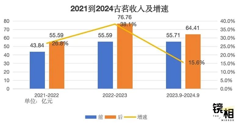 2021年至2023年,古茗收入分别为43.84亿元、55.59亿元以及76.76亿元。其中,2022和2023年分别同比增长26.8%和38.1%。截至2024年9月,古茗收入为64.41亿元,同比增速降到15.6%。