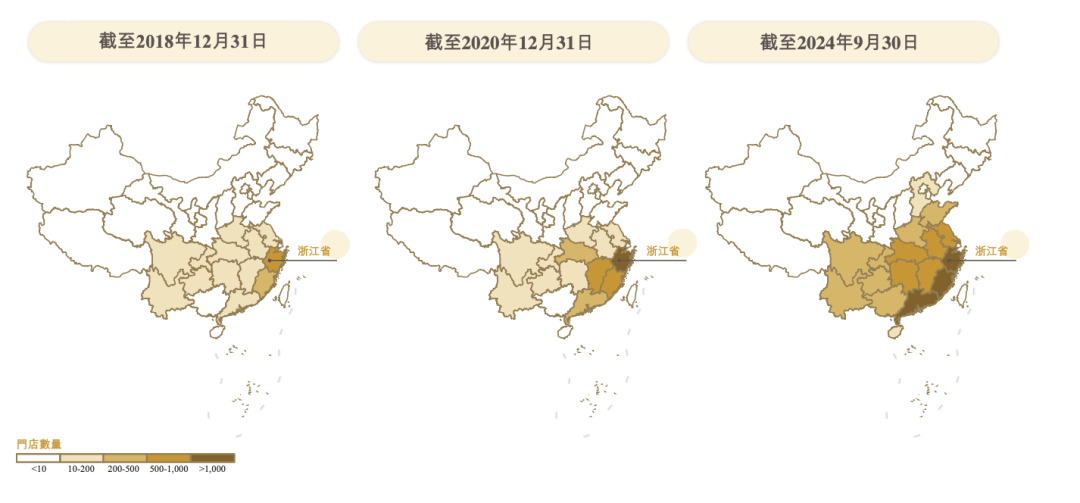 古茗采用地域加密的方法扩张门店。在单一省份门店超过500家被视作“关键规模”,只有在单一省份达到了关键规模,才会考虑进驻周边省份。从浙江起家,古茗目前在浙江、福建、江西、广东、湖北、江苏、湖南和安徽达到了“关键规模”。今年古茗新进驻了两个省份,还有17个省份未进驻。