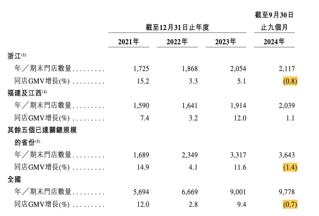2021年至2023年,古茗单店日均GMV均上升,2024年9月首次出现下降,从2023年同一时间的6800元降至6500元,单店日均售出杯数也出现首次下降。在古茗8个“关键规模”省份中,除福建及江西的同店GMV增速处在上升状态,其余区域均在今年第一次出现下滑,浙江同店GMV跌幅为0.8%,其他已达关键规模的五省GMV增速同比下降1.4%。
